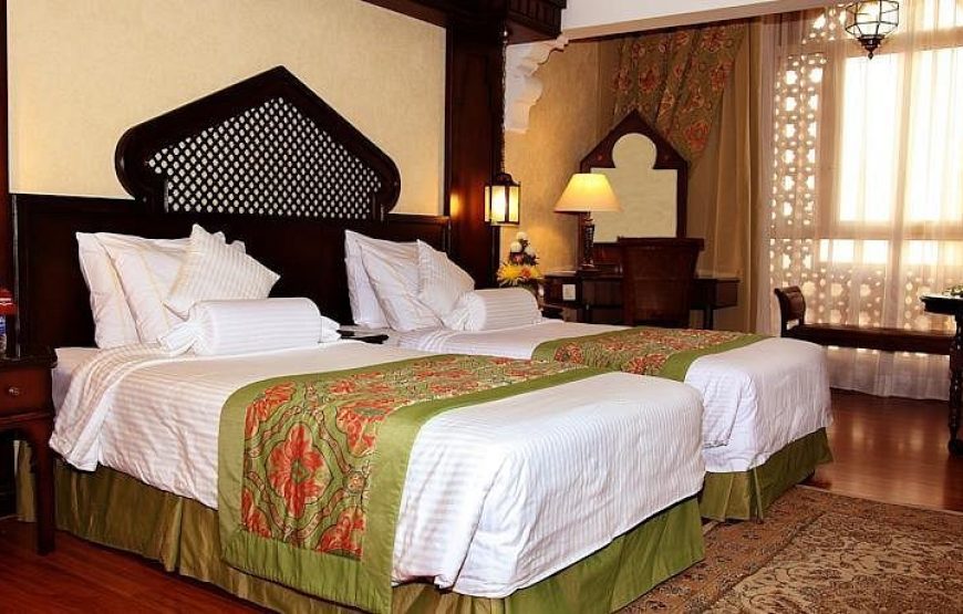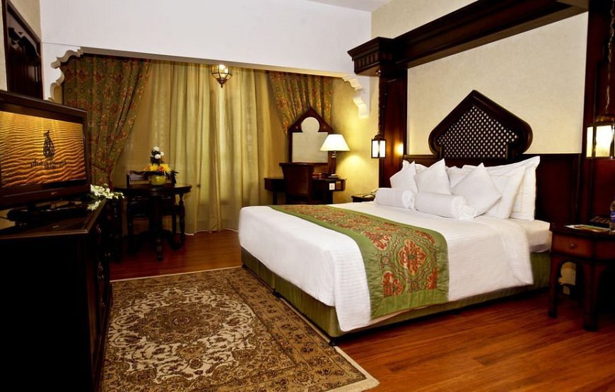 Arabian Courtyard Hotel & Spa, is an Arabian Heritage themed hotel located at the heart of Bur Dubai, in Al Fahidi historical area opposite Dubai Museum. This themed hotel is an ideal location for business & Leisure trips, as it is ideally positioned for sightseeing, shopping and business. The spacious guest rooms are comfortable and decorated in an Arabian style. Rooms come with bottled mineral water and tea and coffee making facilities, guests can enjoy free WiFi in the entire hotel. The hotel offers a wide variety of dining options including the Sherlock Holmes English Pub, Pharaoh Cafe & Restaurant, Chinese Dynasty Restaurant and the Mumtaz Mahal Indian Restaurant, you will have a unique experience through some of the most delicious and mouth-watering recipes from all over the world. Make a tour around the Indian, Mediterranean, Egyptian, Chinese, Thai or International cuisine and become a gourmet with our specialties and signature dishes.