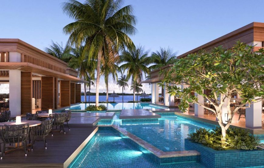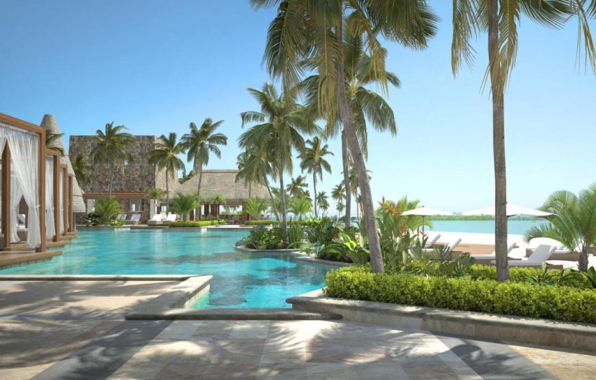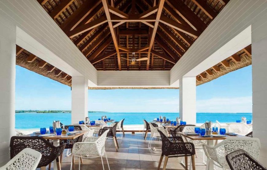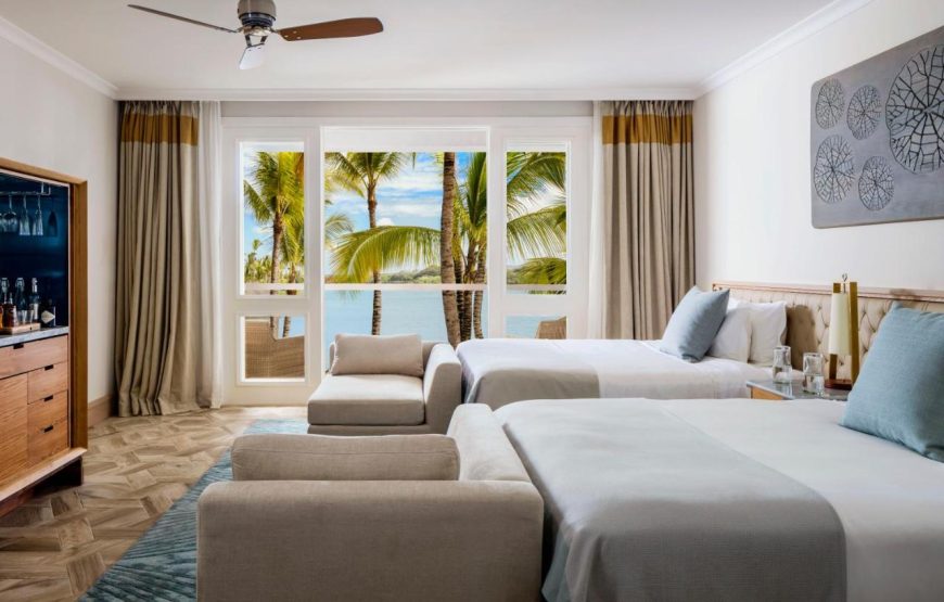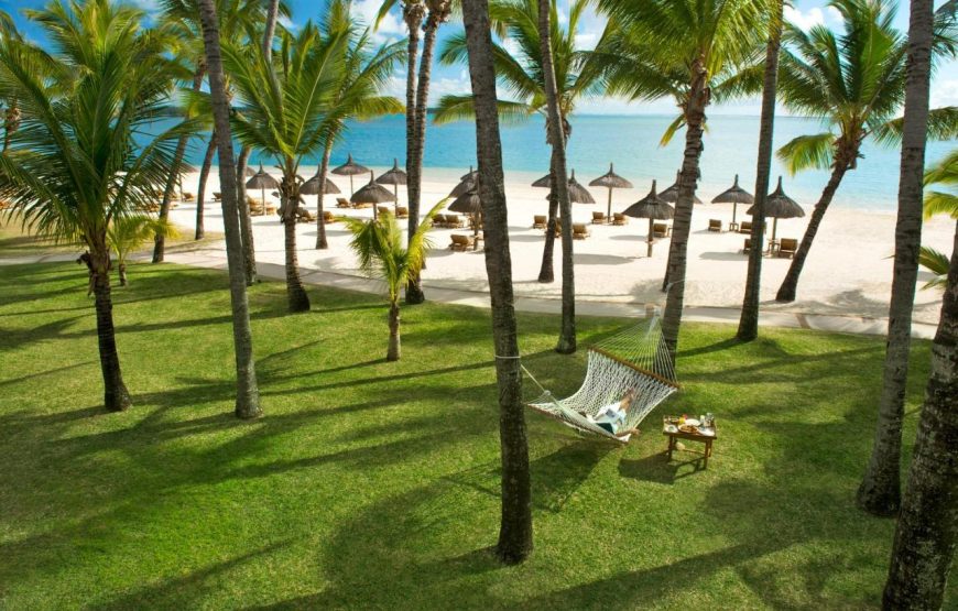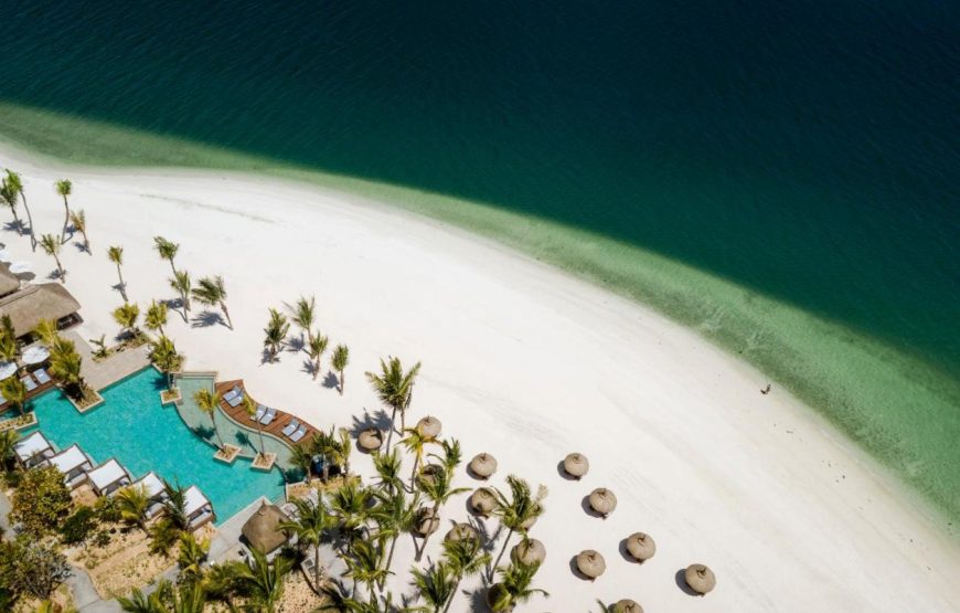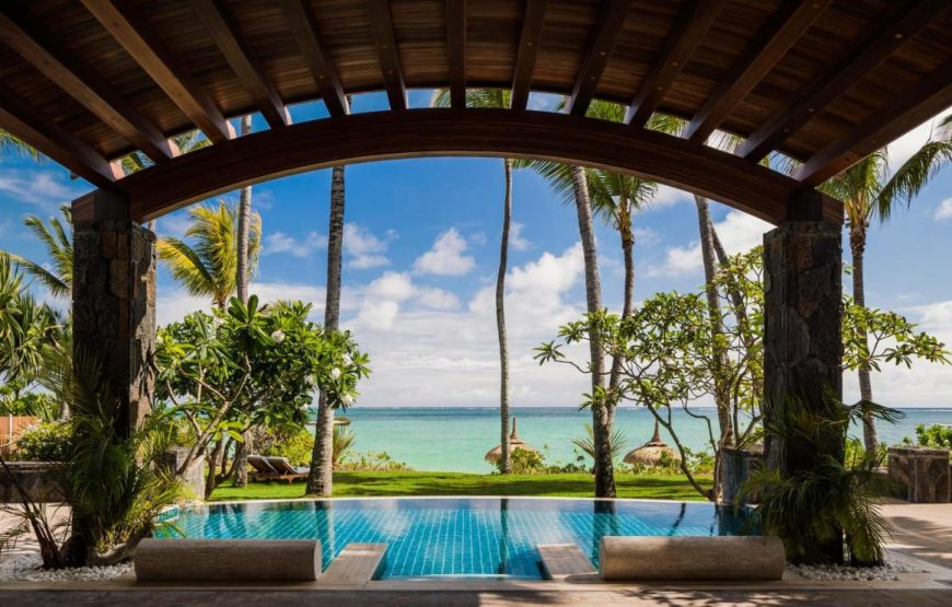 One&Only Le Saint Géran is surrounded by coral reefs and clear waters, and includes a crescent-shaped stretch of white sand beach.