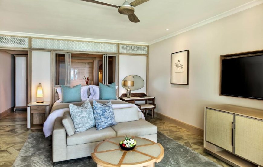 Offering ocean, beach or lagoon views, each room and suite at One&Only Le Saint Géran features island-inspired decor and a furnished outdoor living space. They each have spacious, marble-lined bathrooms with a dressing area and a separate bath and shower.