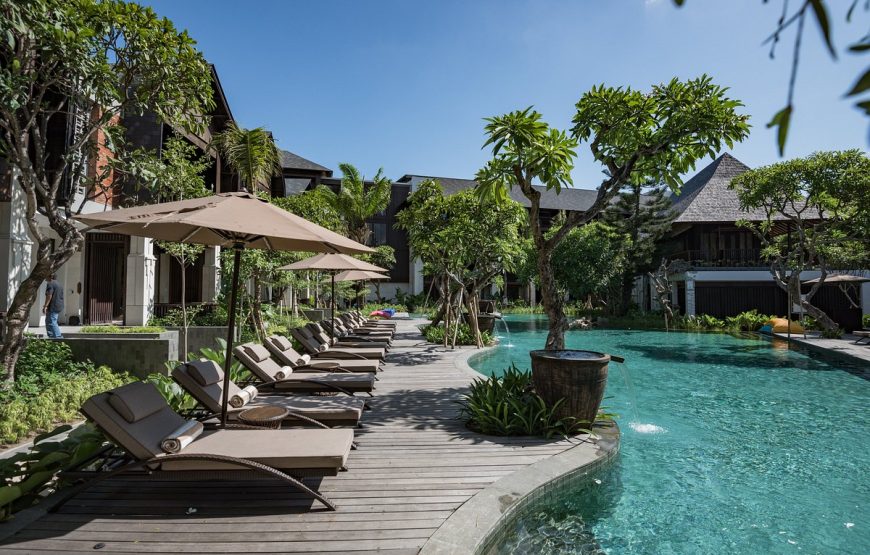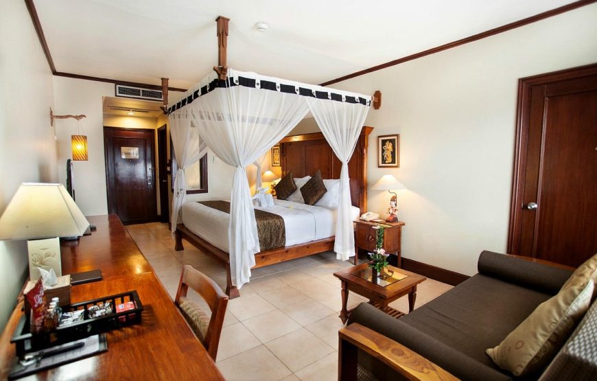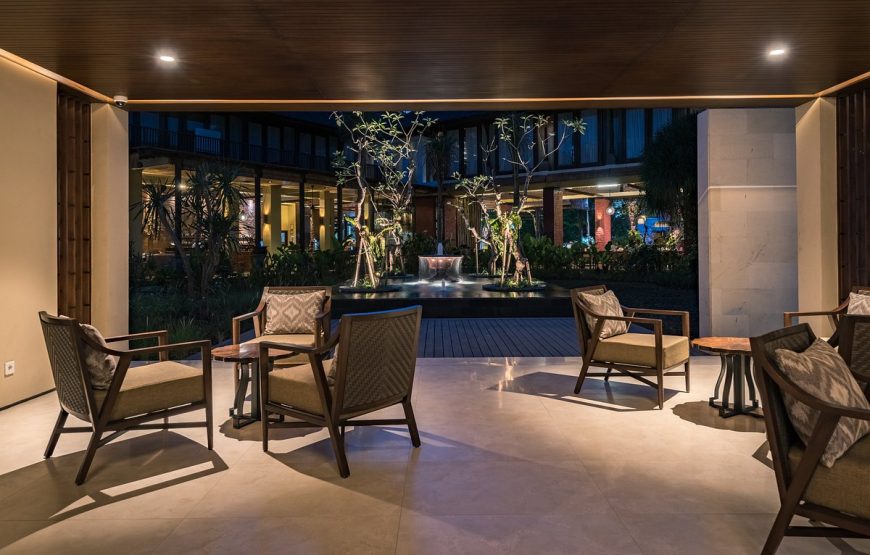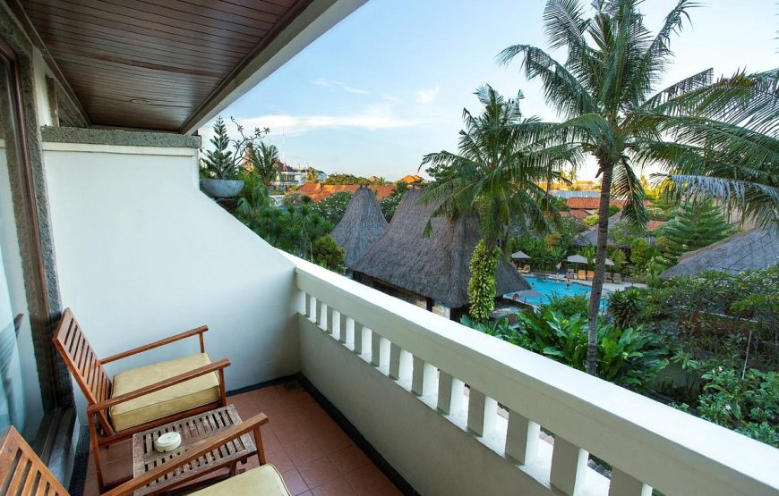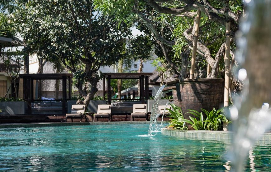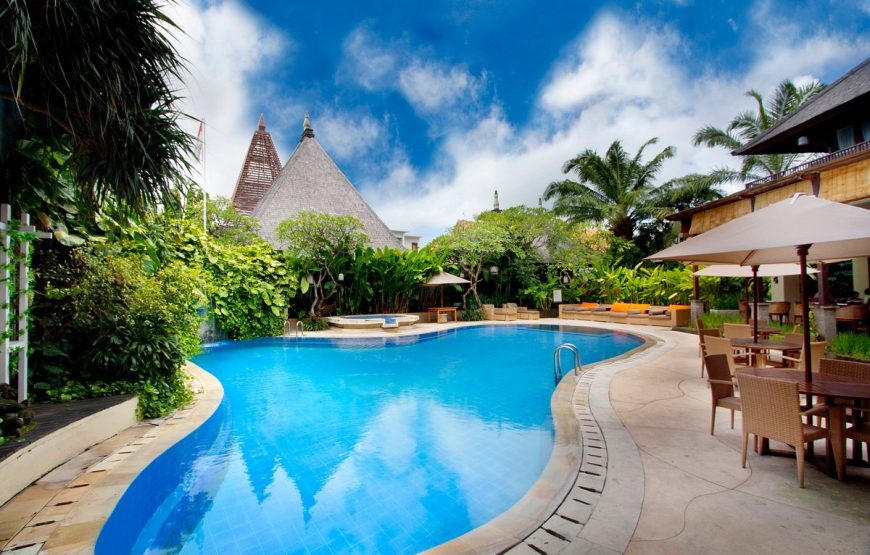 Located in a heart of Kuta, Bali, the resort is hidden away in a tranquil tropical garden, complete with serene koi pools with cascading water features providing the soothing sound of running water. Close to International airport, Kuta Beach, Kuta Art Market, Shopping Center (Discovery Mall, Kuta Square, Kuta Center, and 5 star shopping mall “Kuta Beach Walk”), Food Center, Water bomb, and only walking distance to Night Club.